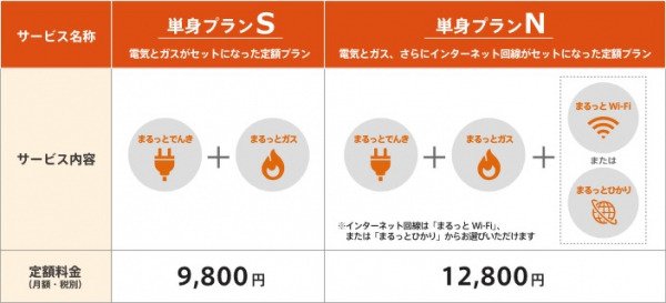 と、電気・ガス・インターネット回線の単身者向け定額パック『まるっと定額パック 単身プランN』の2種類です。