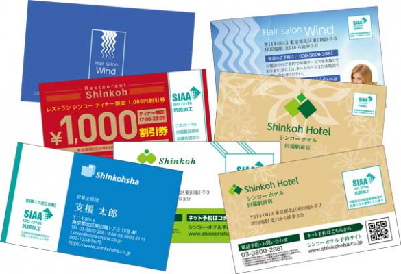 上記、基準を満たした抗菌ニスを印刷物の両面に塗布することで、抗菌性が保たれた安心の名刺・ショップカードが作成できます。