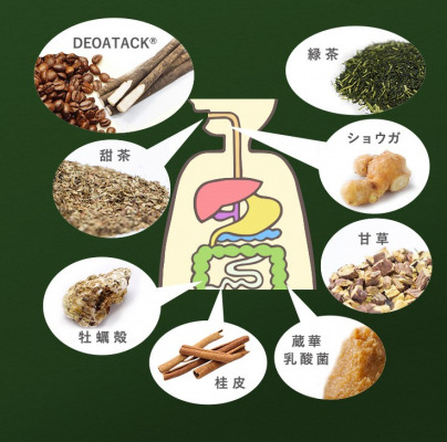 当商品は、植物由来の高濃度ポリフェノール含有素材(基質)と、同じく植物由来のポリフェノール酸化酵素から構成される消臭素材「DEOATAK(R)(デオアタック)」を高配合し(30日分1,200mg)、さらに「緑茶」「ショウガ」「甘草」「蔵華乳酸菌」「桂皮」「牡蠣殻」「甜茶」など、8種の天然成分を当社が開発したオリジナル処方で配合した新商品です。(※「DEOATAK(R)」は高砂工業株式会社の登録商標です。)