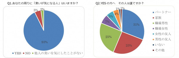最近は「スメル(臭い)ハラスメント」が社会問題として取り上げられるほど、臭いには敏感な時代になってきました。当社がおこなった臭いに関する意識調査では、他人の臭いが気になっている人は約93%、そして約56%がパートナーや家族など身近な人の臭いが気になっていると回答しています。