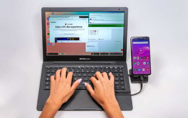 「MirabookテレワークKit」は、手持ちのスマートフォン(android版)に繋げることにより、ラップトップPCとほぼ同等な機能を持たせ、これまでスマートフォンでは画面サイズの問題で対応しきれなかったMicrosoft365(「Word」「Excel」「PowerPoint」「Outlook」「Teams」「OneDrive」)を使うビジネスシーンにも対応できる。また、リモートデスクトップツールを使うことによって会社の自席のPC(Windows)とセキュアにリモートアクセスを可能にします。