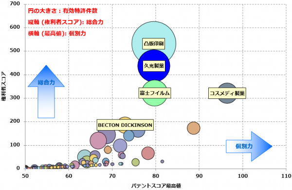 今回の調査では、日本の特許庁で公開されているマイクロニードル関連技術全般について、個別特許の注目度を得点化する「パテントスコア」をベースに、特許の質と量から総合的に見た評価を行いました。