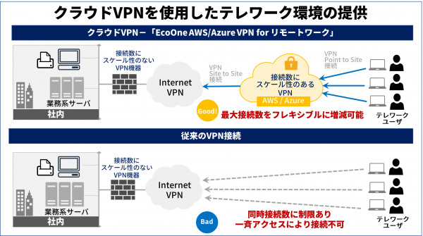 このたび、サービス提供を開始した「EcoOne AWS/Azure VPN for リモートワーク」は、急なテレワークユーザー数の増加に対応が必要な、あらゆる規模のお客様向けに、安全なネットワーク環境を最短1日で提供する クラウド型 リモートVPNサービスです。お客様は当サービスを利用することで、VPN機器の接続制限を超えたアクセスが可能となり、通常の環境で想定されていたよりも多くの社員がセキュアなネットワーク環境でテレワークを行うことが可能となります。また、使った分だけお支払いいただく従量課金制のため、お客様のニーズに応じた一時的なご利用にも最適です。