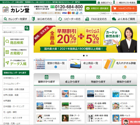 「カレン堂」は、壁掛けタイプや卓上タイプなどのカレンダーに企業名などの名入れ印刷をする、いわゆる『名入れカレンダー』作成の専門サイト。2021年版には、壁掛けカレンダーと卓上カレンダーを合わせて1800点超の商品を掲載しました。