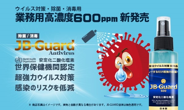 安定化二酸化塩素が主成分のJB-GUARD】は、従来からの同種製品と比べ、(1)インフルエンザ、ノロウイルスや、食中毒の要因となるバクテリア、大腸菌O-157、黄色ブドウ球菌、コレラ菌など多数の細菌に短時間(秒速)での強い除菌効果。 (2)WHO認定・人体への安全性。 (3)次元が違う効果の持続性。
