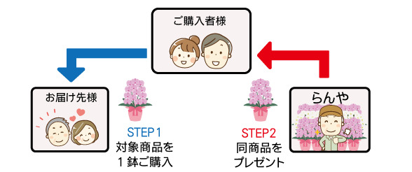 黒臼洋蘭園直営店舗 ネットショップらんやにて【幸せを届けようプロジェクト対象商品】をお買い上げのお客様に、当園からご購入者様へも胡蝶蘭をプレゼントいたします。