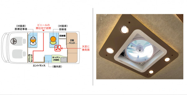 車両の受検者側スペースの天井には換気扇が取り付けられ、これにより車内にウイルスが滞在することを防ぎます。キャンピングカーに搭載されているサブバッテリーで使用するため、電源が取れない場所でも換気が可能です。