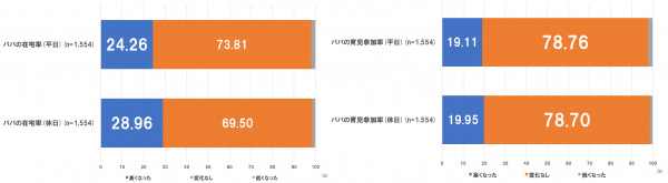 平日・休日ともに新型コロナウイルス流行前と比べて「変化なし」と答えたママが8割弱。流行前も育児参加率が高いパパは「流行後も高い状況を維持」しており、流行前も育児参加が低いパパは「流行後でも低いまま」という結果に。