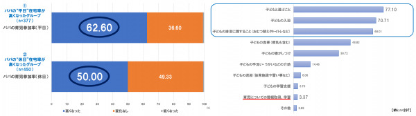 子どもと遊んだり、お風呂に入れたり、おむつ替えなどを行うことは以前に比べ増やしているものの、「育児についての情報取得、学習」に関しては、いまだママ任せなのかもしれない。