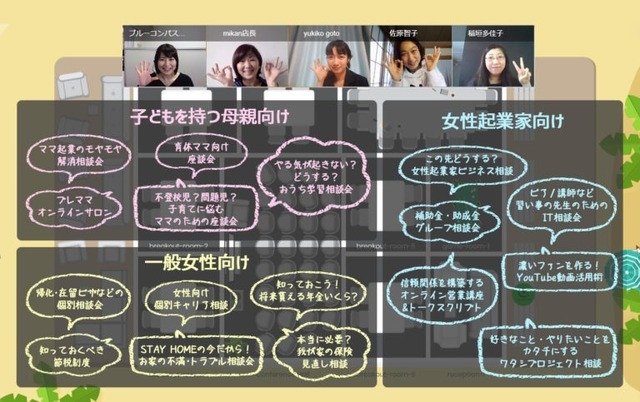 横浜で女性専用のコワーキングスペース・学習塾を運営している株式会社ブルーコンパス(本社:神奈川県横浜市、代表取締役:蜂谷詠子)は、緊急事態宣言下における女性達の不安を軽減するために気軽に参加・交流・相談できる場所として「オンラインコワーキング」を4月13日より期間限定で開催しています。