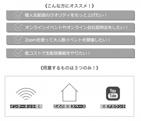 現在、新型コロナウイルスの影響で、各種イベントの開催、大規模の動画撮影などが自粛を求められている中、オンラインイベントの配信、個人での生配信、小規模ネット生配信番組のニーズが高まっています。