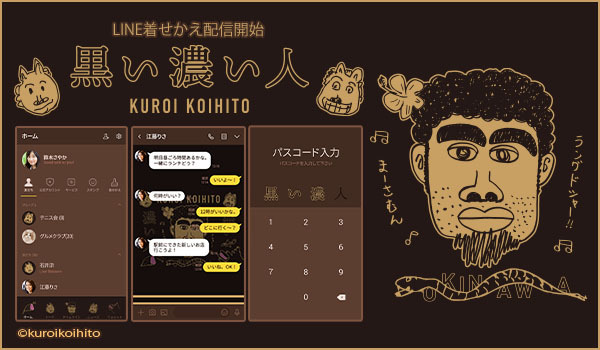 2018年秋頃、日本テレビ系例「月曜から夜ふかし」に出演し、話題になった平良司(たいら つかさ)さん。番組では「嫁ニー」と名付けられている。その平良司さんが発案したお菓子「黒い濃い人」のLINE着せかえが新登場!メニュー画面にはお菓子のパッケージにも使われているイラストを使用し、濃い茶色をメインカラーとしたカラースキンとなっております。是非、LINEを「黒い濃い人」に着せかえてはいかがでしょうか。