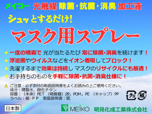 この製品は、吹き付けるだけで、手持ちのマスクを簡単に高機能な光触媒マスクに加工できるというもので光が当たることにより、イオン吸着力で常にウイルスを吸いつけてマスクの内側に入り込みにくくし、また常に除菌・消臭し続けます。これにより飛沫感染のリスクを大きく軽減し、マスクの安全なリサイクルも助けます。