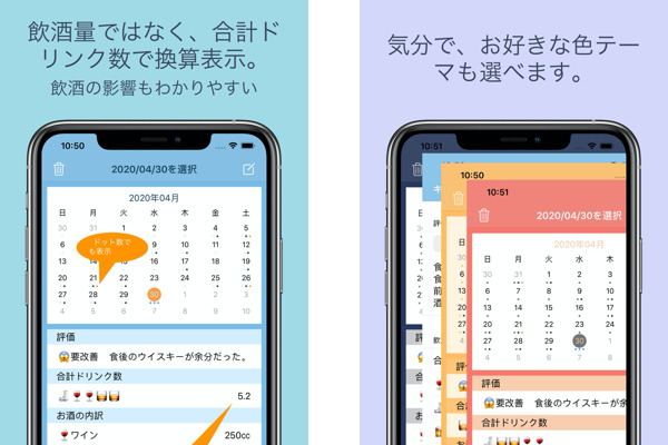 達成した日の自分へのご褒美や飲みすぎた日の戒め、減酒の決意などを象徴できるように、色テーマや飲酒量棒グラフを多彩な選択肢から選べます。基本機能でも、酒別のアルコール濃度や上限量、カレンダーの細かな調整等々、ユーザーの好みでカスタマイズ可能です。