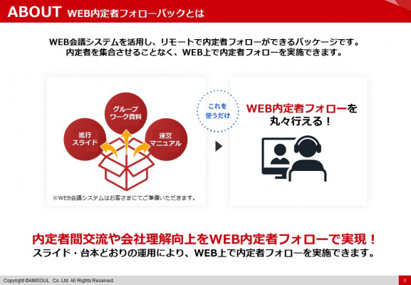 WEB会議システムを活用し、オンライン上で内定者フォローイベントができるパッケージ商品です。内定者を集合させることなく、WEB上で完結することができます。本商品には、内定者同士の相互理解や会社理解につながるワークショッププログラムをはじめ、運営に必要な投影スライドデータ、運営マニュアル、タイムテーブルが含まれているため、イベント運営が初めての人事ご担当者様でも簡単に実施することができます。