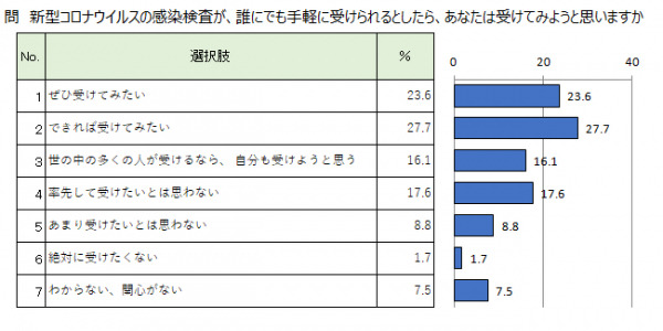 調査の中で、「新型コロナウイルスの感染検査が、誰にでも手軽に受けられるとしたら、あなたは受けてみようと思いますか」と訪ねたところ、「ぜひ受けてみたい」は23.6%、「できれば受けてみたい」は27.7%、「世の中の多くの人が受けるなら、 自分も受けようと思う」は16.1%と、合わせて67.4%の人が前向きな回答をしました。