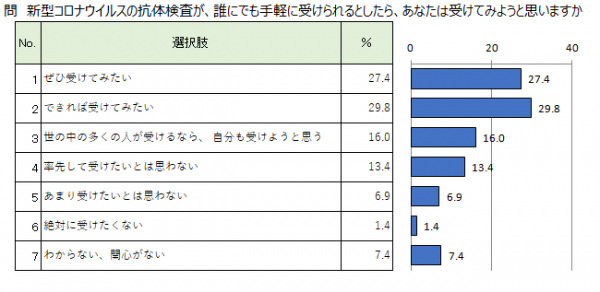 調査の中で、「新型コロナウイルスの抗体検査が、誰にでも手軽に受けられるとしたら、あなたは受けてみようと思いますか」と訪ねたところ、「ぜひ受けてみたい」は27.4%、「できれば受けてみたい」は29.8%、「世の中の多くの人が受けるなら、 自分も受けようと思う」は16.0%と、合わせて73.2%の人が前向きな回答をし、「感染検査」よりも多い結果となりました。