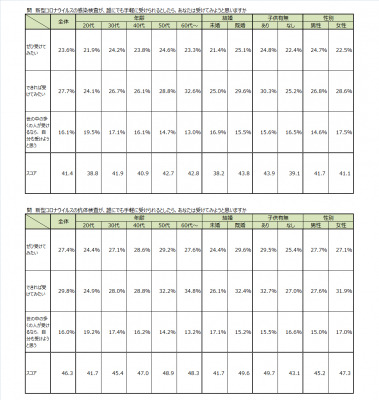 新型コロナウイルスの感染検査や抗体検査について、約7割の人が受けることに前向きなことが分かりました。また、年齢が高いほど検査を受けることに前向きで、既婚者、子供ありの人ほど検査により前向きなことが分かりました。地域別では、沖縄県が検査に前向きな回答をした人が最も多い結果となりました。