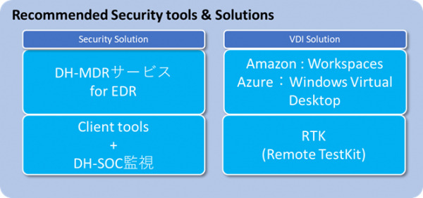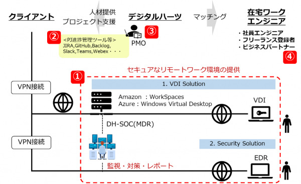 当社では、このような課題に対するニーズにお応えするため、セキュアなソフトウェア開発環境から必要な人材までをワンストップで迅速に提供する「リモートワークエンジニアリングサービス」を開始いたしました。まず、プロジェクトの円滑な遂行に欠かせないプラットフォームの構築に向けて、エンドポイントを中心に15万台以上のデバイス監視実績を有する当社のセキュリティ監視チーム「DH-SOC」による各種セキュリティツールを活用したセキュアなリモート環境の提供、プロジェクトの規模や要件に応じた柔軟なコミュニケーションツールの選定等をサポートします。また、人材面においては、当社グループの社員エンジニアやフリーランス登録者、ビジネスパートナーも活用した幅広いエンジニア人材を提供するほか、当社グループの経験豊富なプロジェクト管理者が在宅エンジニアを含む多様なメンバーのマネジメントを行うPMO(Project Management Office)サービス等、リモート開発環境へのシフトをワンストップで総合支援いたします。