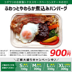 食べ応えのある粗挽き肉を使用し、お肉の旨みが凝縮されたハンバーグに100時間煮込んだ特製ソースで、濃厚な甘口味で、ご飯がすすみます!調理工程でグリルした、ジューシーさを保つため冷燻で仕上げたベーコンも逸品です!