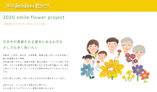 「2020スマイルフラワープロジェクト」(https://jfc.thebase.in/)は、株式会社ジャパン・フラワー・コーポレーションが運営するフラワーロス問題を背景に、花生産者の支援を目的にした花救援サイトです。コロナ禍の影響を受けた生産者を支援するため、農家より配送の専用ボックスにての箱買いを推奨しています。普段では買えない本数をあり得ない割引価格でご提供致します。ご自宅にたくさんの花で華やぎと明るさを「STAY HOME からSWEET HOMEへ」