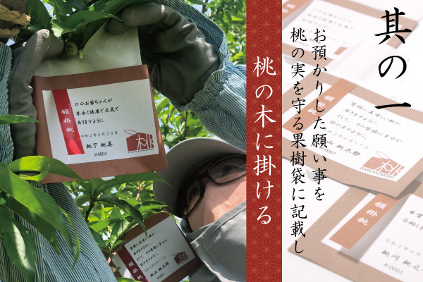 桃農家が行う「果実袋かけ」という農作業に、皆様の「願いを掛ける」というサービスを組み込んだこれまでにない桃の販売方法となります。大きな特徴は4つとなります。