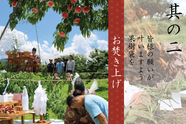 (2)実が成長し除袋された「願の掛かった果樹袋」 を、畑に神社の宮司様においでいただき、皆様の願いが無事成就されますよう「御焚上の儀」 を行っていただきます。