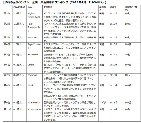 【世界の医療ベンチャー企業 資金調達額ランキング(ZUVA調べ)】
