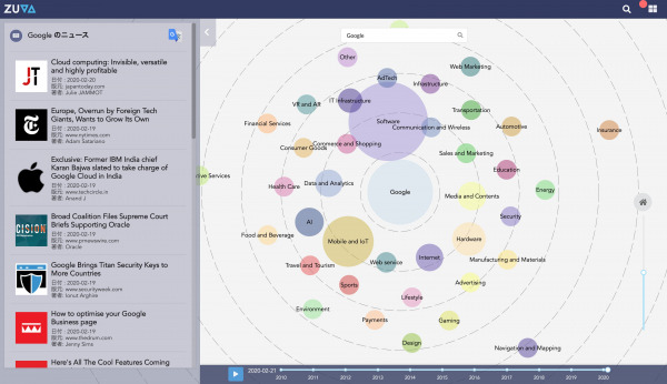 「ZUVA」は、世界100万社のスタートアップをデータベース化し「GAFA(※)がどういった分野に注力しているか」「ライバル会社がどのような分野に注力しているか」「自社が注力している分野にどういったスタートアップが活動しているか」等、知りたい情報を色々なストーリーで、素早く、安価で、的確に「新規事業のネタ」となる「ユニークな技術サービスを提供する世界のスタートアップを見つける」ことが出来るプラットフォームです。