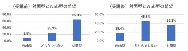 受講前後で対面型/Web型の希望を、『新型コロナウイルスが発生していなかった場合』という想定で尋ねたところ、受講前は対面型希望者が65.3%だったものの、受講後には36.3%に減少しました。一方、Web型の希望者は、Web講義受講後に18.4%(約2倍)に増え、どちらでも良いと合わせた割合は63.7%となりました。このことより、Web講義を実際に受講したことで、抵抗感や不安感が大幅に減っていることがわかります。