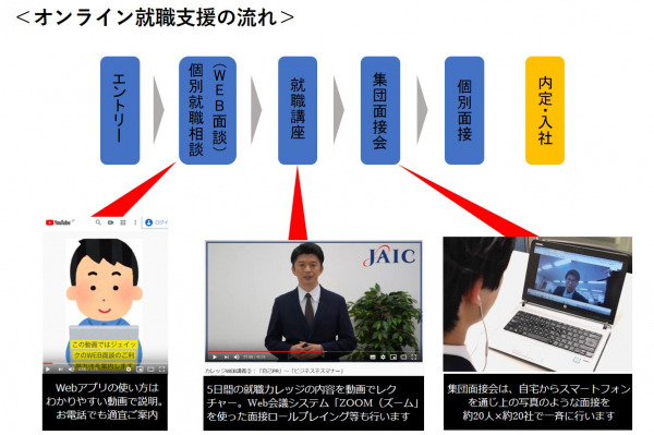 当社では全国10拠点で提供する「就職カレッジ(R)」「女子カレッジ(R)」「セカンドカレッジ(R)」「30代カレッジ」「新卒カレッジ(R)」の就職支援サービスを完全Web化して提供しています。ITに不慣れな中堅中小企業に対しても、オンライン面接のインフラを提供するなど、採用活動の継続をサポートしています。求職者や採用企業からは「対面での活動ができない中で、このようにWebで支援してくれることは有難い」といった声が寄せられています。