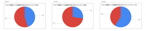 夫婦と違いカップルの場合には出会ってからの時間が浅い場合や同居していない場合も多く、自粛により会えなくなるど変化を受けやすく夫婦に比べ、変化を感じた人が多かったと思われます。