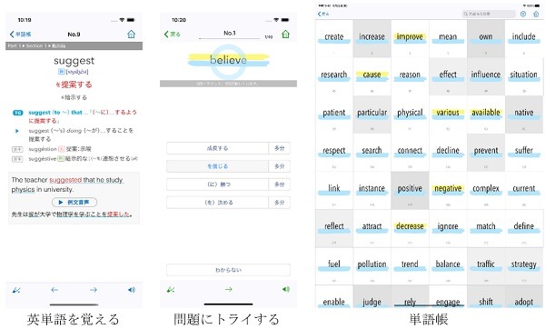 ステップ3では、4択問題、手書き入力、キーボード入力、音声認識の4つの解答方式で解答できます。選択肢の中から語義や英単語を選ぶだけでなく、書いたり声に出したりして覚えることができるので、英単語のスペリングや発音も身につけることができます。