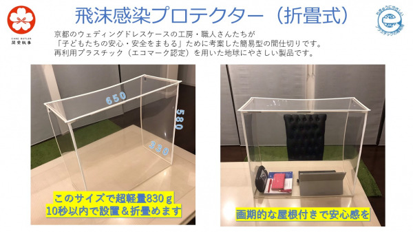 「飛沫感染プロテクター」は、再生ペット樹脂を使用し屋根付きで安心感があり10秒で折畳み持ち運びできる超軽量の間仕切りです。これから夏を迎え気温があがるなか、つらくてついマスクを外してしまいがちな子供たちや高齢者を飛沫感染から守ります。