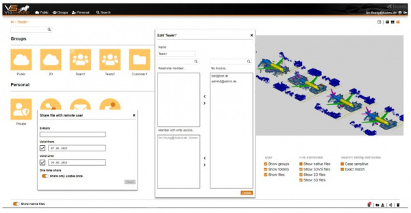 Kisters 3DViewStation VisShareは、各々のCADデータを管理(プロジェクト用、個人用)できます。データの共有においては、CADを閲覧する方法が無いメンバーへも閲覧期限、閲覧回数の設定を設定、URLのリンクを送信するだけで共有可能です。