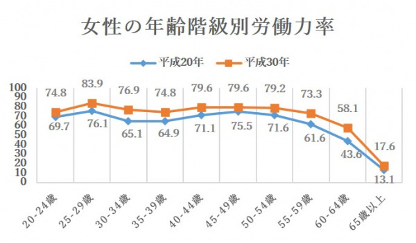 厚生労働省資料によると、平成20年には30歳前後の女性の就業率は約70%だったのに対し、平成30年には約80%になっており、女性の労働数は増加傾向にあります。しかしながら、女性の非正規就業割合は、この15年間常に50%を超えており、20%台をキープする男性と、大きな格差があります。女性の正規雇用は、まだまだ進んでいないのが現状です。
