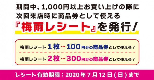 2020年6月12日(金)~2020年7月5日(日)の期間、1,000円以上のお買い物で1枚、「梅雨レシート」を発行、お渡しします。