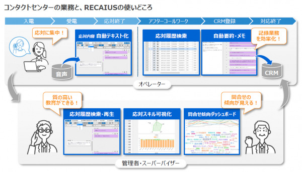 「BlueBean×RECAIUS コンタクトセンタープラス」は、コールセンターで働く人々を支援するソリューションです。特徴は以下となります。