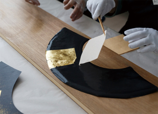 箔の自然に割れる表情や、薄さ、柔らかさなどの特性を活かし、職人の手作業により一点一点表情が異なる扇子に仕上げました。