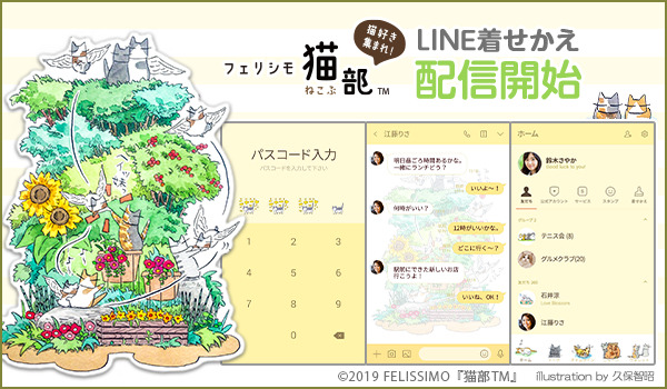2010年9月から活動を開始し、猫好きが集まる部活動「フェリシモ猫部」。「猫と人がともにしあわせに暮らせる社会」を目指し、販売している募金付きのオリジナル猫グッズは多くの方の声をとり入れて企画開発をしています。グッズ販売だけでなく、「今日のにゃんこ」、「猫ブログ」や猫の写真を投稿できる「猫部トーク」など様々なコンテンツがございます。先行で販売し、大好評を博した霜田有沙、山野りんりんに続く、フェリシモ猫部の新作LINE着せかえでは日本画家の久保智昭のイラストを使用した、見ているだけでほっこりしてしまう「ゆるかわいい」デザインになっています。LINEを着せかえて癒されてみてはいかがでしょうか。