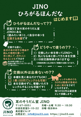 東京杉並の南口仲通商店街に2020年2月にオープンした補聴器・補聴援助システムの専門店、耳のそうだん室JINOを運営する株式会社JINO(所在地:東京都杉並区、代表取締役社長郷司智子)は補聴器や補聴援助システム、難聴と認知症の関係、騒音性難聴の予防など、耳についてもっとたくさんの人に気軽に楽しく知ってもらい、荻窪の地域全体の耳のお悩みに寄り添いたいという目的で、店舗の一角にて本の交換サービス、「JINOひろがるほんだな」のサービスを開始します。