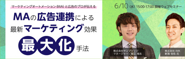 そこで本ウェブセミナーでは、デジタルマーケティングにおけるさまざまなプロモーションを手掛ける株式会社IMK様との共催で、マーケティングオートメーション(以下MA)と広告を連携させてマーケティング効果を最大化させる手法をテーマにして解説いたします。