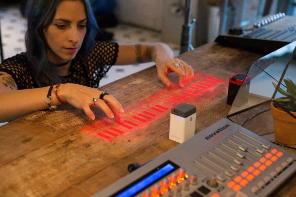 箱型のSerafim Keyboの電源を入れると、平らな面にレーザーで仮想的なパソコンのキーボードを映し出します。