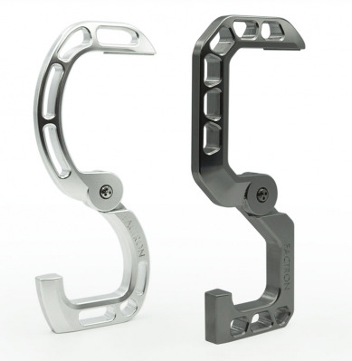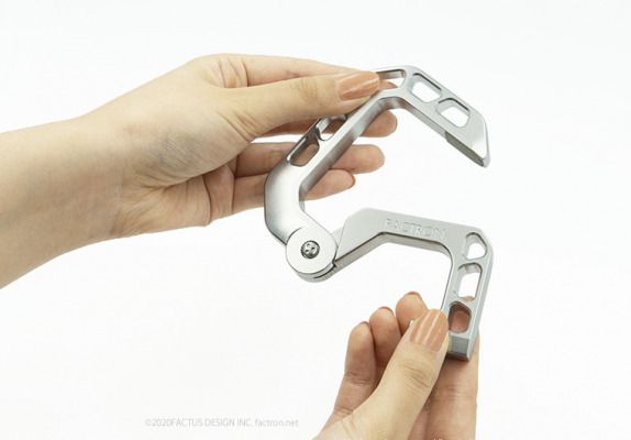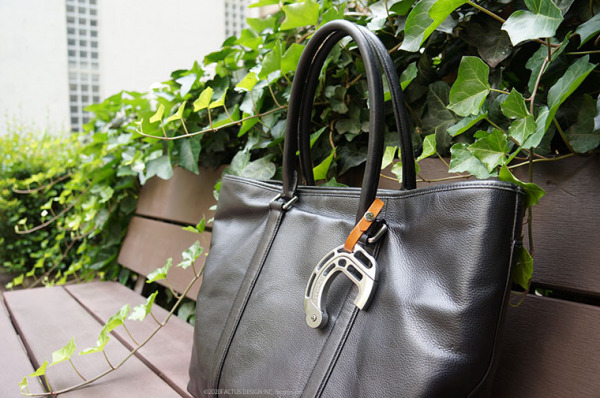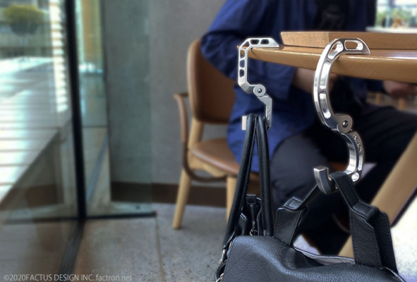 ジュラルミンA2017(アルミ合金)を削り出したバッグハンガー。床はウイルスや細菌がたまりやすい場所。とくにウィルスが気になる昨今、カフェやレストランなどでバッグや手荷物を直に置きたくない時に、手軽にテーブルなどにかけておくことができます。