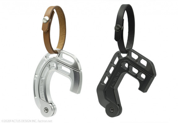 折りたたみ式でコンパクトに収納でき、ブラックとブラウンから選べる本革のボタン付ストラップが付属します。デザインは、丸みを帯びた『Trineo(トリネオ)』と建築のトラス構造がモチーフの『TRUSS(トラス)』の2種。