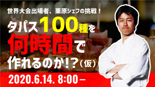 新型コロナウイルスの蔓延により外出がままならない昨今、多くのサービス業の売上に影響が出ています。トーキョーアートは飲食店を応援する企画のひとつとして、オンライン番組を制作、生配信します。パエリア世界大会日本代表シェフであり、虎ノ門にある「エルトラゴン」「エルトラゴン アルプント」のオーナーでもある栗原靖武シェフが、スペイン料理タパス100種類をカメラの前で作ります。