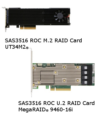 Vertica-423NCMシリーズは、Broadcom Tri-Mode ROC SAS3516チップを使用したM.2 NVMe SSD RAIDカード(UT34M2, RAID-0/1/5/6/10)に接続される4枚までのM.2 NVMe SSDと、オンボードM.2ソケットに接続される2枚までのM.2 NVMe SSD(RAID-0/1)が実装可能です。