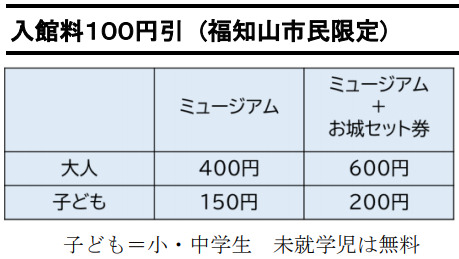 割引方法: 広報ふくちやま1月号の13ページ左上の割引券を切り取り、ミュージアムチケットセンターに提示