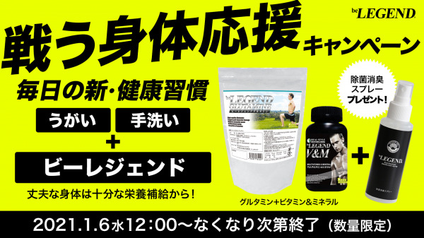 本商品はビタミンやミネラルを高配合した「ビーレジェンド V&M マルチビタミン&ミネラル」、コンディションをサポートするアミノ酸サプリメントの「ビーレジェンド グルタミン 500g」、自然素材の除菌スプレーの「ビーレジェンド 除菌消臭スプレー※非売品」をセットにし、限定価格にて販売致します。