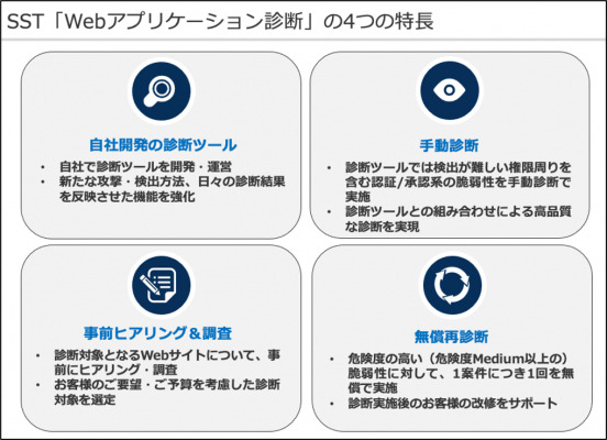SST の脆弱性診断サービスは、Web アプリケーションやネットワークのセキュリティ問題に精通した SST の技術者が Web サイトの問題点を隅々まで診断し、情報漏えい等重大事件の発生防止をお手伝いします。
